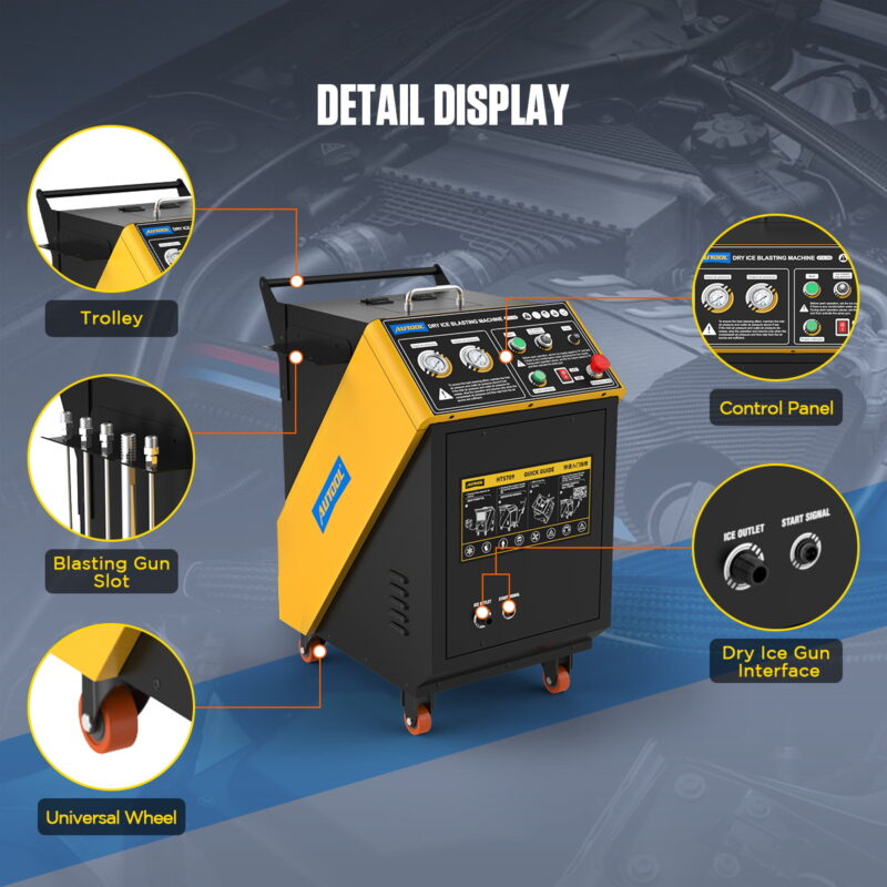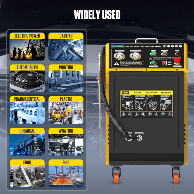 TECNOLOGÍA DE HIELO SECO (CO2)La máquina AUTOOL HTS709 utiliza el fenómeno de la sublimación, es decir, el paso directo del dióxido de carbono del estado sólido al gaseoso. Este proceso es incomparablemente más eficaz que el lavado a presión tradicional o el arenado. Tres etapas de eliminación de suciedad: