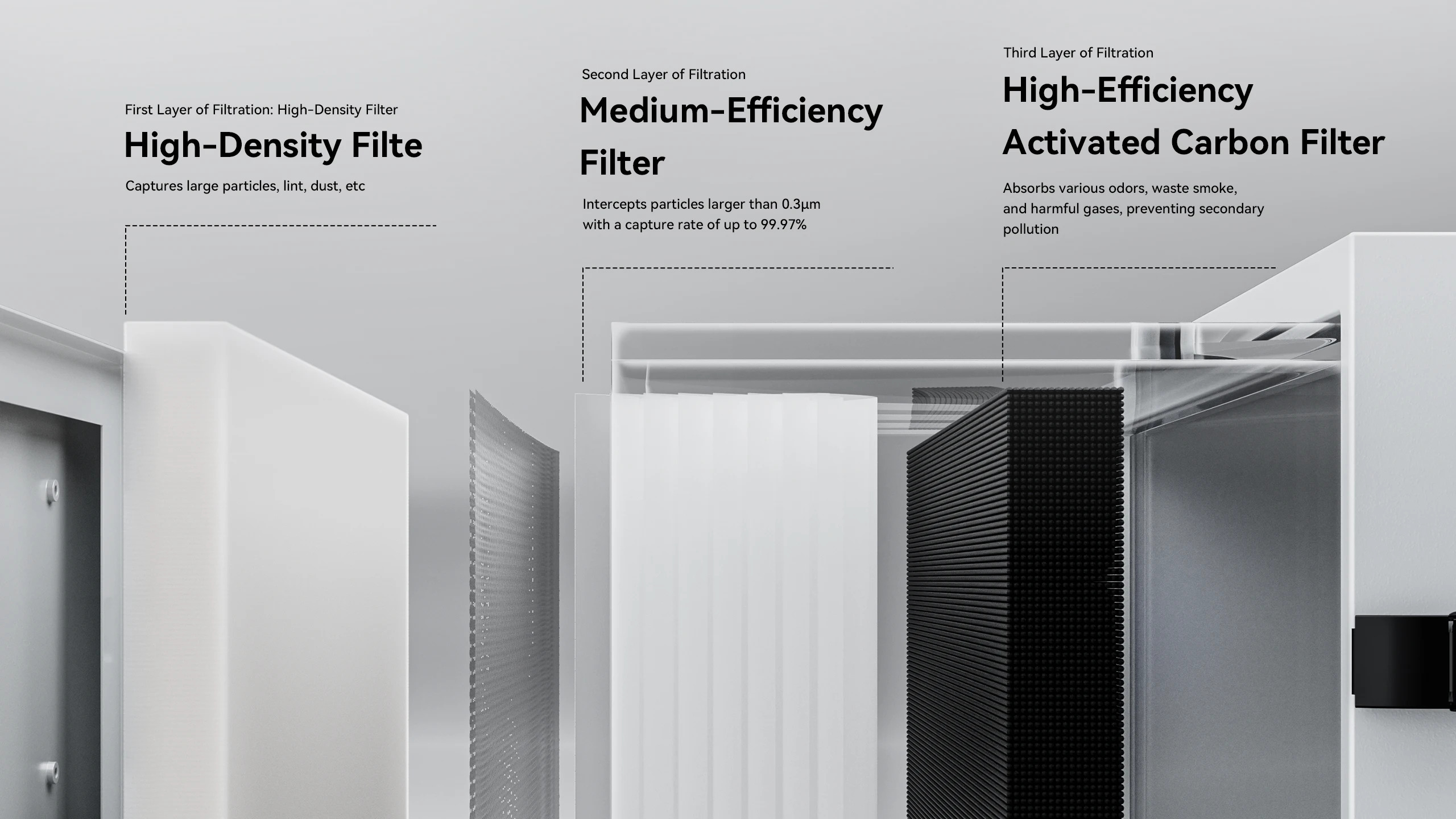 Utiliza un cartucho masivo HEPA H13 y una gruesa capa de carbón activado para eliminar el polvo fino (PM2.5/PM10), el humo irritante y los compuestos orgánicos volátiles peligrosos (TVOC, formaldehído).