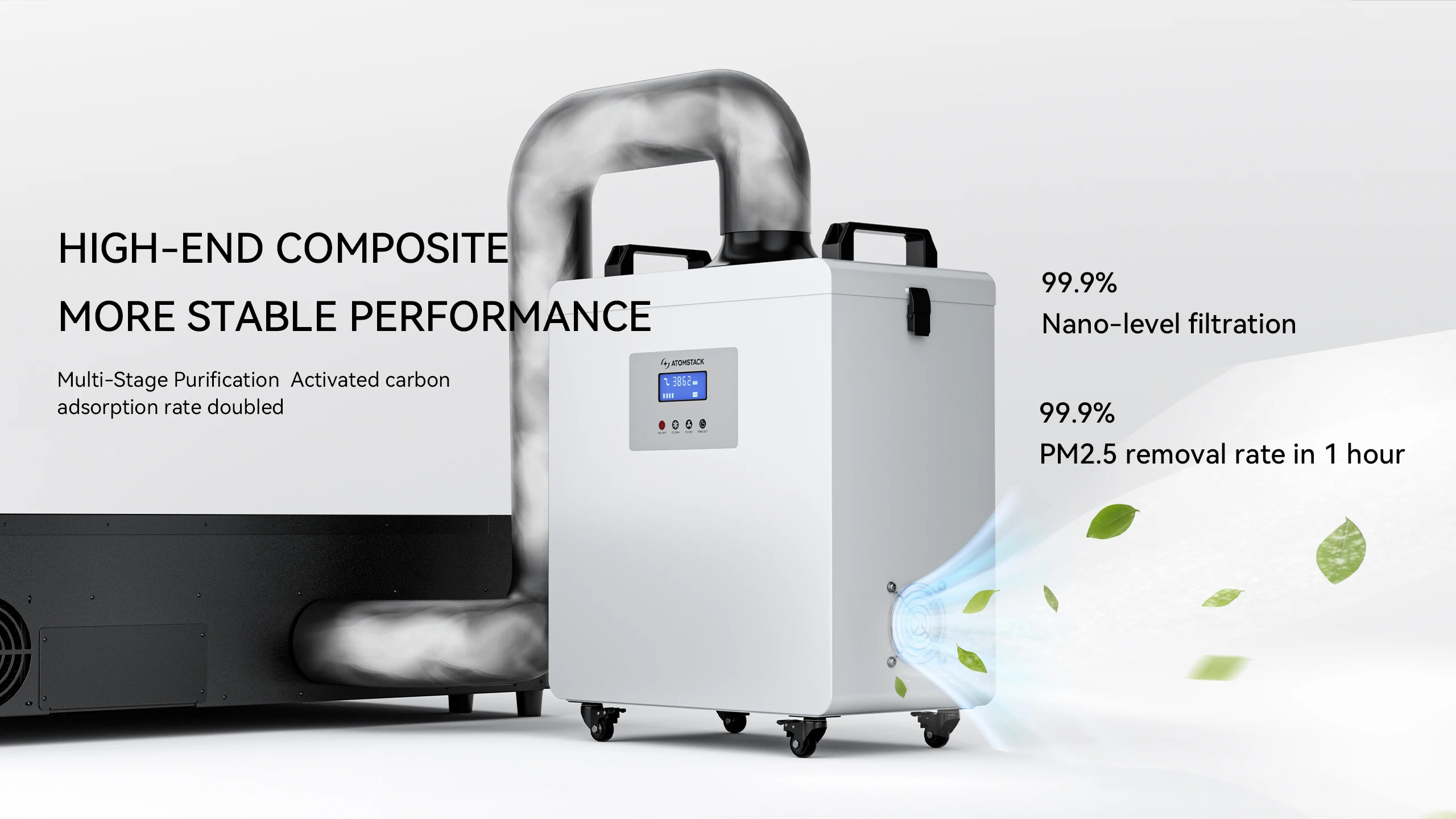 Garantice una seguridad total con el AtomStack D4. Este extractor de humo ofrece una eficiencia de filtración del 99,97%. A diferencia de las soluciones económicas de bajo presupuesto, el modelo D4 está equipado con un potente motor sin escobillas (5200 RPM) que garantiza un flujo de aire industrial de hasta 22,5 m/s, funcionando de manera extremadamente silenciosa.